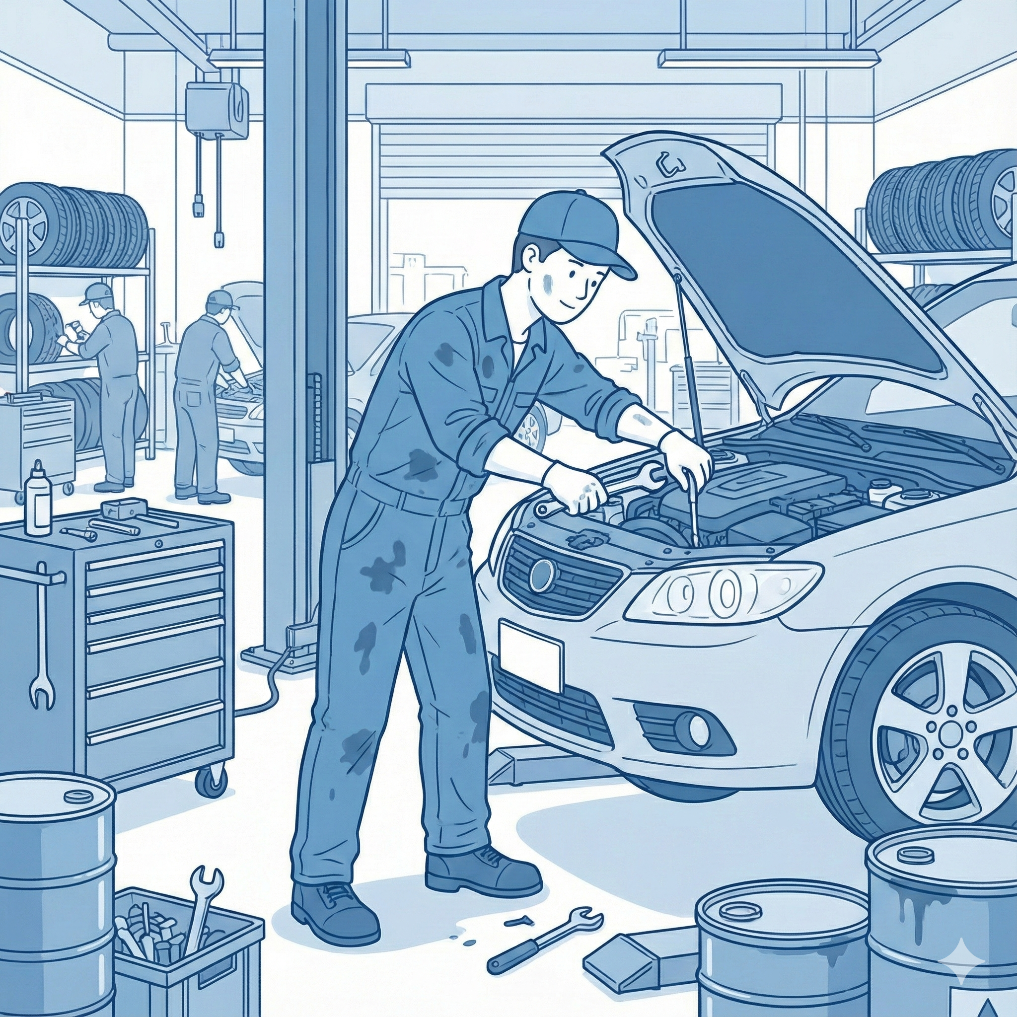 たとえば、タイヤ交換、オイル交換、バッテリー点検、ブレーキパッドの交換など、日常的なメンテナンス作業を担当します。