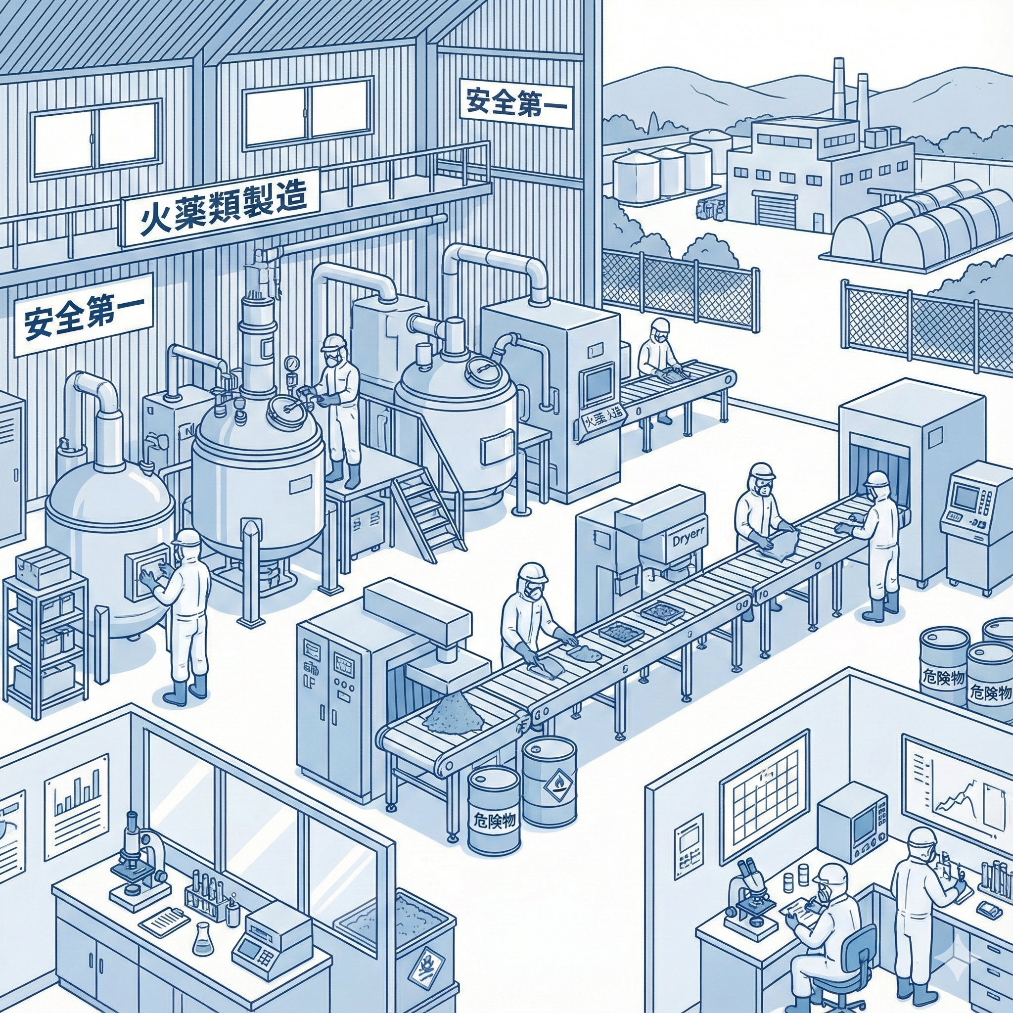 製造工程1つでも誤れば爆発や火災のリスクがあり、高度な専門知識と正確な管理が求められます。