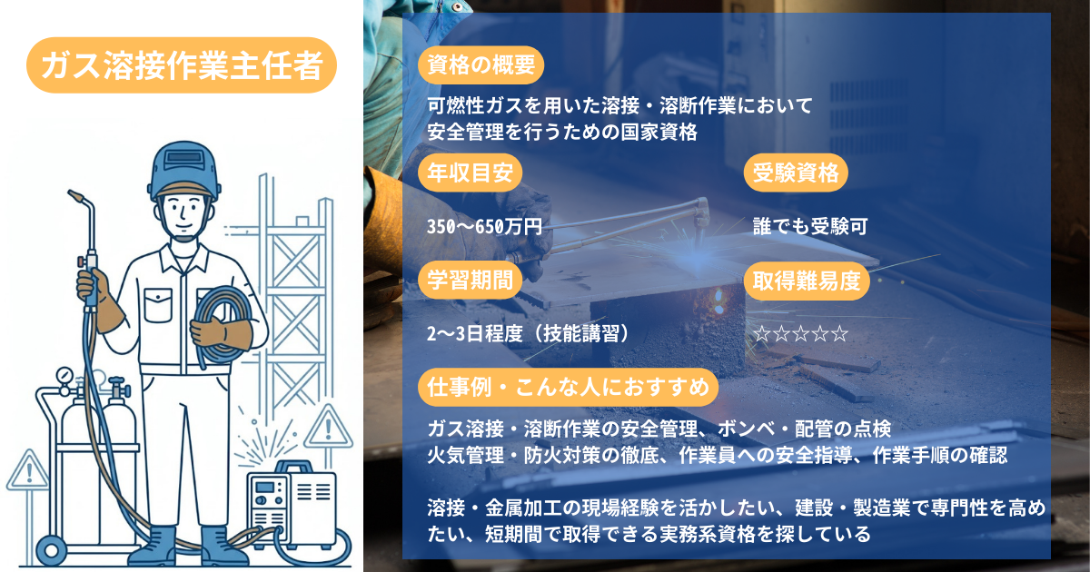 この記事では、ガス溶接作業主任者の資格の概要・仕事内容・試験内容・就職先・年収までをわかりやすく解説します。