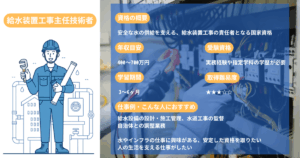 「給水装置工事主任技術者との違い」や「どんな職場で働けるのか」など、あなたのキャリア選びに役立つ情報が満載です。